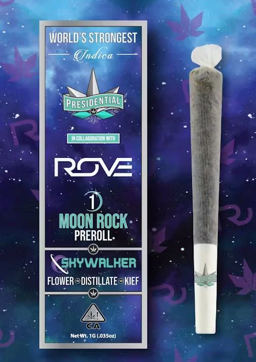 Your Presidential Moon Rock Preroll consist of estate grown, single sourced flower. The flower is then INFUSED with premium distillate formulated by award winning manufacturer Rove, using Presidential’s proprietary infusion process that enables us to permeate the flower to the stem. Finally, it is coated in the highest quality kief, creating the slowest burning, most potent Moon Rocks on the market! Our blunts are ground and rolled for your enjoyment! Every Puff of Skywalker is an out of this world experience!