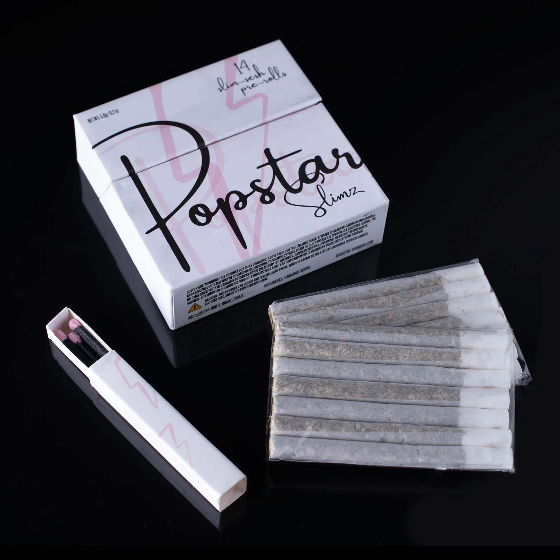 Introducing Popstar Slimz: Fourteen sleek, 0.4g pre-rolls perfect for discreet enjoyment. These "dog walker" style pre-rolls are rolled with premium nugs, not stuffed with trim, and feature all-natural biodegradable filters. Housed in a stylish, reusable flip-top box with custom matches inside, each pre-roll is sealed for freshness. No cones, just pure quality