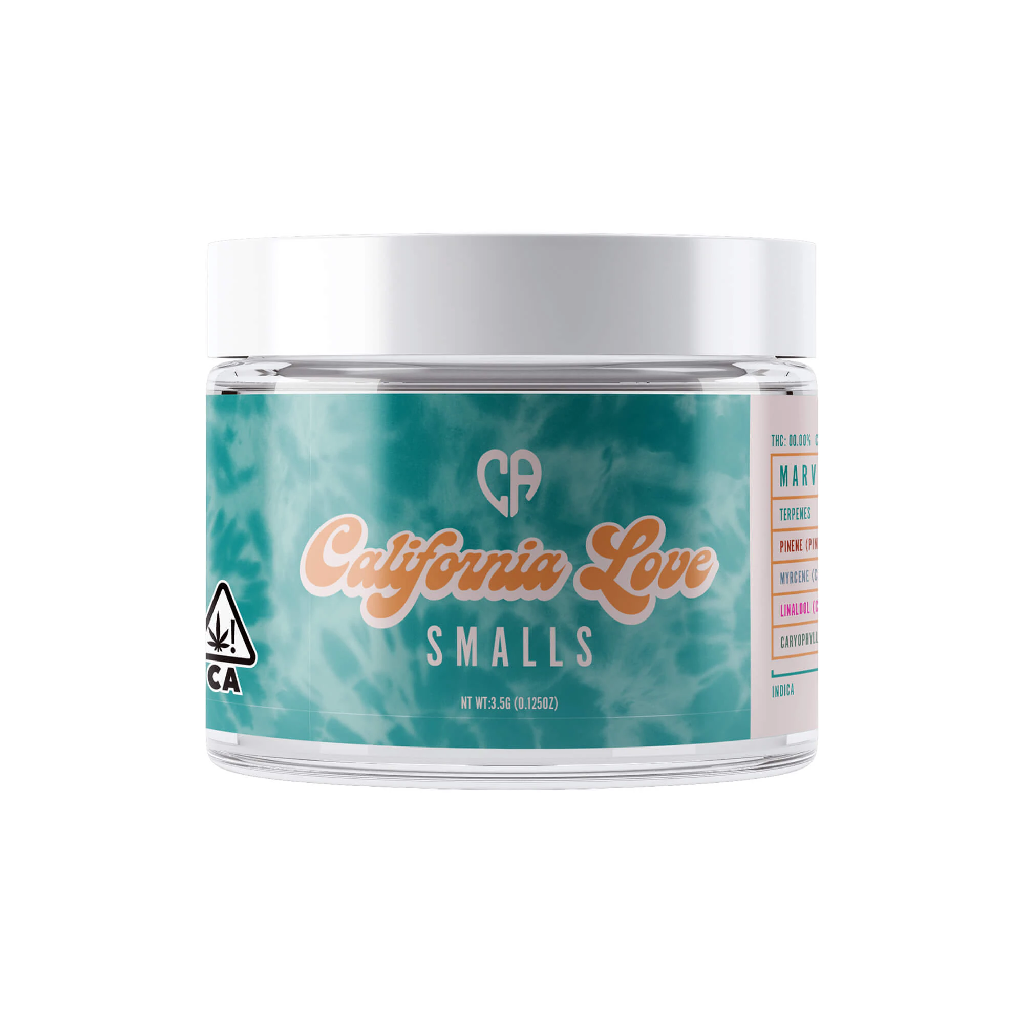 Small buds, big high! California Love Smalls are perfect for cost-conscious consumers who love quality flower, regardless of bud size. Available in 3.5g, 7g, and 14g jars, there’s an option for everyone. Strains are carefully selected and packaged to ensure buds are not too small, but just right! The terpene breakdown chart is featured prominently on every jar to inform user experience and create consistency for all effect and flavor preferences.