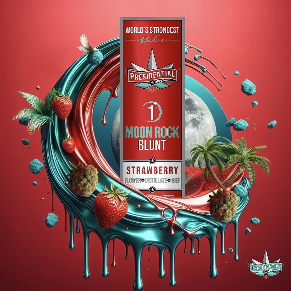 Your Presidential Moon Rock Blunt consists of Top-Shelf Organic Flower INFUSED with Premium THC Distillate and then Coated in the Highest Quality Kief. Our innovative proprietary infusion process enables us to permeate the flower all the way to the stem! Our Moonrocks our ground and wrapped in a 100% tobacco FREE blunt wrap!